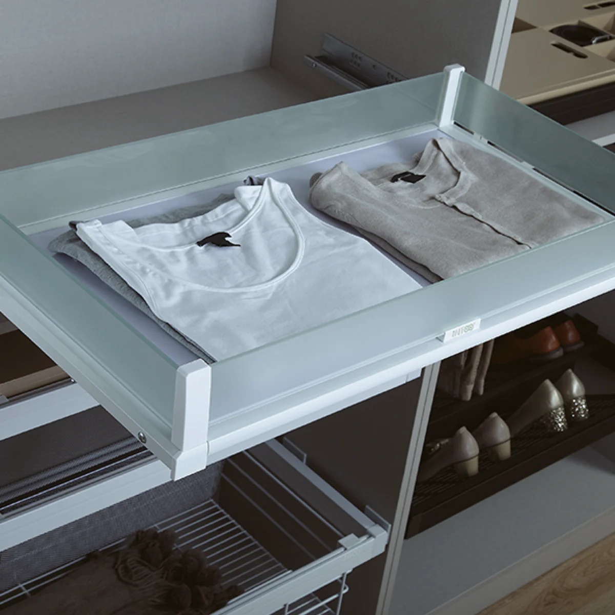 - Cajón blanco con laterales y frontal de cristal de 130mm de alto para muebles de 700mm de ancho.