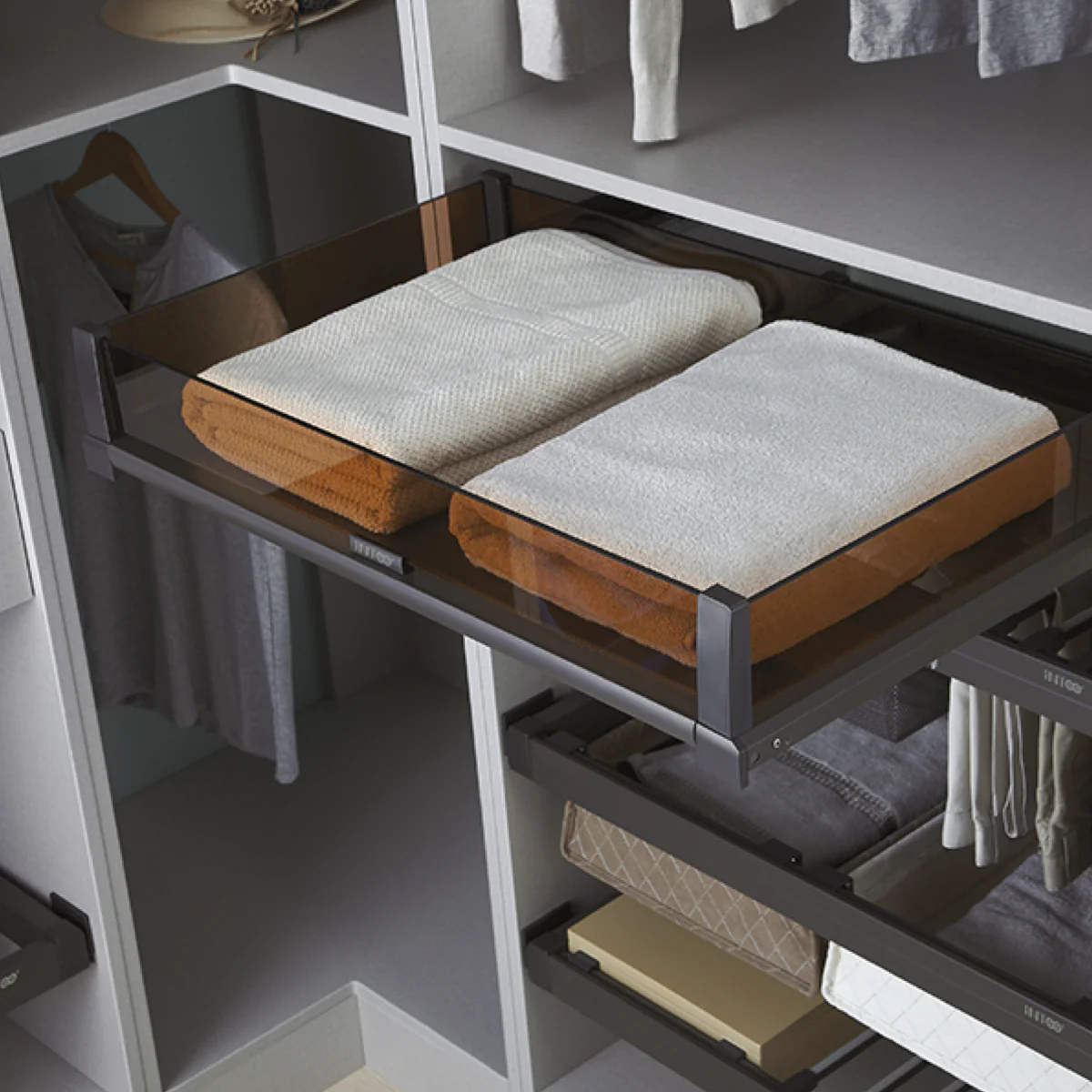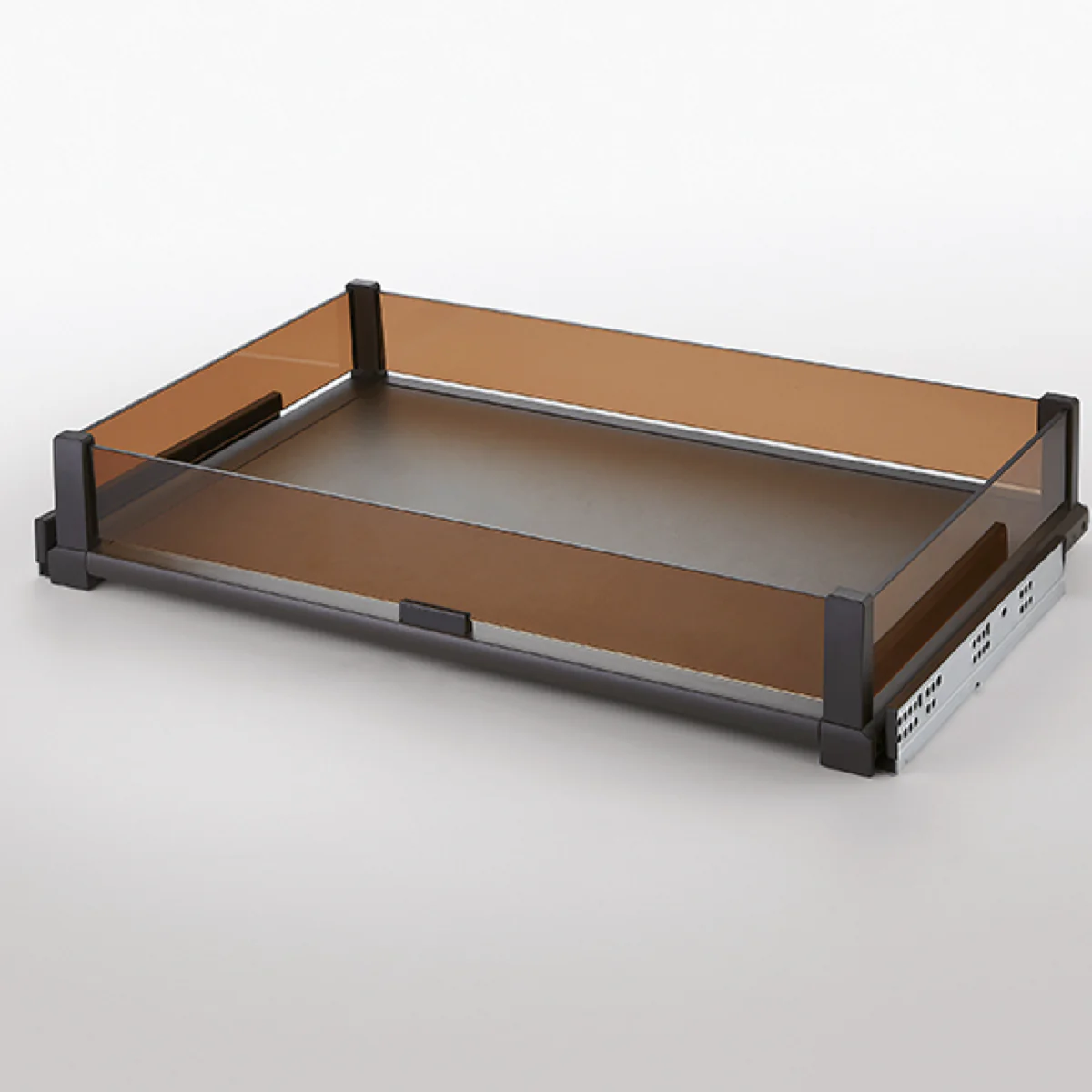- Cajón marrón con laterales y frontal de cristal de 130mm de alto para muebles de 800mm de ancho.