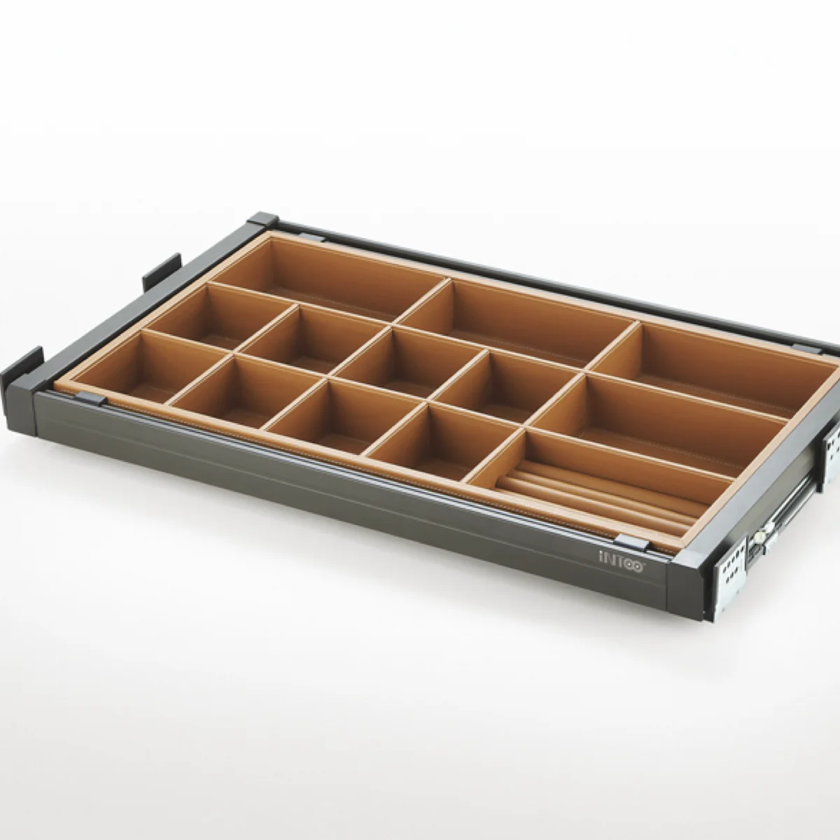 - Cajón organizador joyero en acabado marrón con piel sintética en acabado cámel para muebles de 800mm de ancho (bordes incluidos).