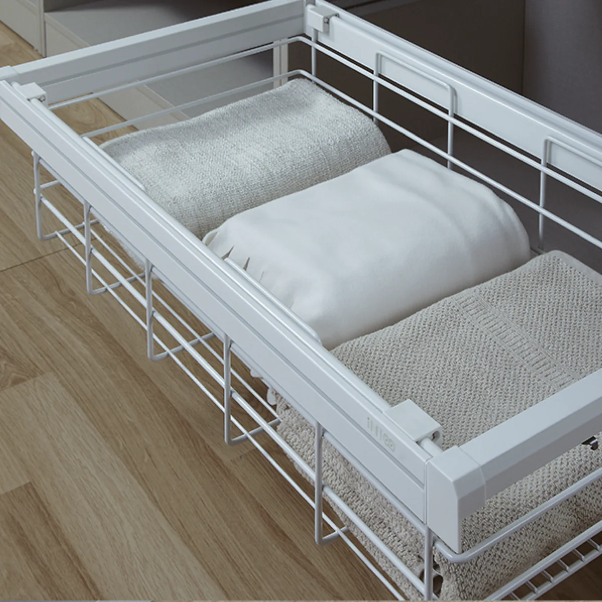 - Cesta blanca de varillas metálicas acabado blancas para armarios de 900mm de ancho con un ajuste de 864 a 914mm.