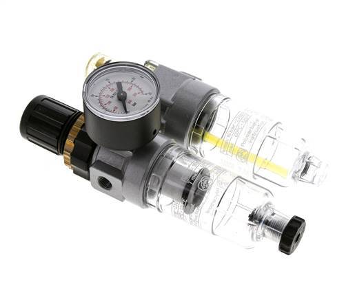 Esta unidad neumática FRL (Filtro Regulador Lubricador) de 1/8 pulgadas G se utiliza para filtrar los contaminantes de más de 5 micras y regular la presión de salida entre 0,5 y 16,0 bar (7 y 232 psi). y lubricar el aire con aceite. El regulador se autorregula. Incluye un manómetro. El caudal máximo es de 350 l/min (utilice siempre el diagrama de caudal para dimensionar correctamente). La válvula de purga semiautomática se abrirá cada vez que se cierre el aire comprimido. Adecuado para una entrada máxima de 16,0 bar (232 psi) y temperaturas entre -10 y 60 °C (14 y 140 °F). El caudal mínimo para el goteo de aceite es de 40 l/min. La capacidad de aceite es de 17 cm3. Para ajustar la presión de salida, tire del volante hacia arriba y gírelo. Bloquee empujando la rueda hacia dentro.