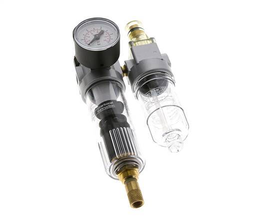 Esta unidad neumática FRL (Filtro Regulador Lubricador) de 1/8 pulgadas G se utiliza para filtrar los contaminantes de más de 5 micras y regular la presión de salida entre 0,5 y 6,0 bar (7 y 87 psi). y lubricar el aire con aceite. El regulador se autorregula. Incluye un manómetro. El caudal máximo es de 350 l/min (utilice siempre el diagrama de caudal para dimensionar correctamente). La válvula de drenaje automático se abrirá y cerrará automáticamente en función del nivel de residuos. Adecuado para una entrada máxima de 16,0 bar (232 psi) y temperaturas entre -10 y 60 °C (14 y 140 °F). El caudal mínimo para el goteo de aceite es de 40 l/min. La capacidad de aceite es de 17 cm3. Para ajustar la presión de salida, tire del volante hacia arriba y gírelo. Bloquee empujando la rueda hacia dentro.