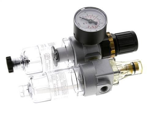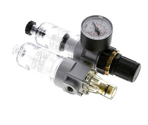 Esta unidad neumática FRL (Filtro Regulador Lubricador) de 1/8 pulgadas G se utiliza para filtrar los contaminantes de más de 5 micras y regular la presión de salida entre 0,5 y 6,0 bar (7 y 87 psi). y lubricar el aire con aceite. El regulador se autorregula. Incluye un manómetro. El caudal máximo es de 350 l/min (utilice siempre el diagrama de caudal para dimensionar correctamente). La válvula de purga semiautomática se abrirá cada vez que se cierre el aire comprimido. Adecuado para una entrada máxima de 16,0 bar (232 psi) y temperaturas entre -10 y 60 °C (14 y 140 °F). El caudal mínimo para el goteo de aceite es de 40 l/min. La capacidad de aceite es de 17 cm3. Para ajustar la presión de salida, tire del volante hacia arriba y gírelo. Bloquee empujando la rueda hacia dentro.