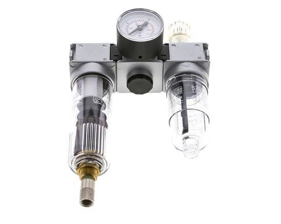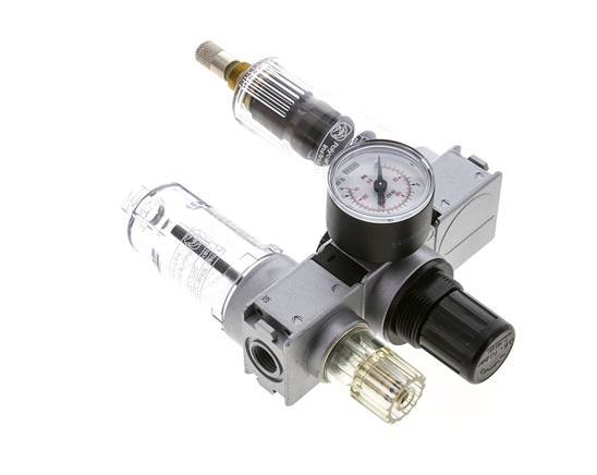 Esta unidad neumática FRL (Filtro Regulador Lubricador) de 1/4 de pulgada G se utiliza para filtrar los contaminantes de más de 5 micras y regular la presión de salida entre 0,5 y 10,0 bar (7 y 145 psi). y lubricar el aire con aceite. El regulador se autorregula. Incluye un manómetro. El caudal máximo es de 750 l/min (utilice siempre el diagrama de caudal para un dimensionamiento correcto). La válvula de drenaje automático se abrirá y cerrará automáticamente en función del nivel de residuos. Adecuado para una entrada máxima de 12,0 bar (174 psi) y temperaturas entre -10 y 60 °C (14 y 140 °F). El caudal mínimo para el goteo de aceite es de 26 l/min. La capacidad de aceite es de 35 cm3. Para ajustar la presión de salida, tire del volante hacia arriba y gírelo. Bloquee empujando la rueda hacia dentro.