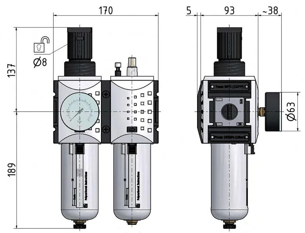 FRL 2 Partes G3/8” 3500l/min 0.5-8.0bar/7-116psi Semi-Automático Policarbonato Futura 2