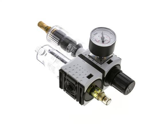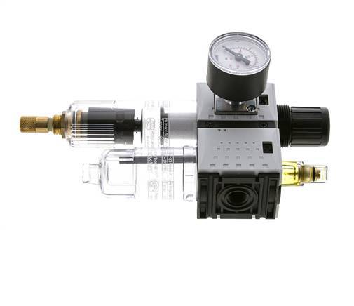 Esta unidad neumática FRL (Filtro Regulador Lubricador) de 1/4 de pulgada G se utiliza para filtrar los contaminantes de más de 5 micras y regular la presión de salida entre 0,5 y 10,0 bar (7 y 145 psi). y lubricar el aire con aceite. El regulador se autorregula. Incluye un manómetro de 40 mm. El caudal máximo es de 800 l/min (utilice siempre el diagrama de caudal para dimensionar correctamente). La válvula de drenaje automático se abrirá y cerrará automáticamente en función del nivel de residuos. Adecuado para una entrada máxima de 12,0 bar (174 psi) y temperaturas entre -10 y 50 °C (14 y 122 °F). El caudal mínimo para el goteo de aceite es de 26 l/min. La capacidad de aceite es de 35 cm3. Para ajustar la presión de salida, tire del volante hacia arriba y gírelo.