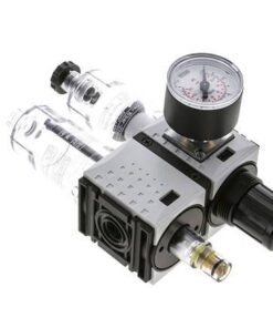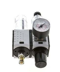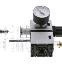 Esta unidad neumática FRL (Filtro Regulador Lubricador) de 1/4 de pulgada G se utiliza para filtrar los contaminantes de más de 5 micras y regular la presión de salida entre 0,5 y 8,0 bar (7 y 116 psi). y lubricar el aire con aceite. El regulador se autorregula. Incluye un manómetro de 40 mm. El caudal máximo es de 800 l/min (utilice siempre el diagrama de caudal para dimensionar correctamente). La válvula de purga semiautomática se abrirá cada vez que se cierre el aire comprimido. Adecuado para una entrada máxima de 12,0 bar (174 psi) y temperaturas entre -10 y 50 °C (14 y 122 °F). El caudal mínimo para el goteo de aceite es de 26 l/min. La capacidad de aceite es de 35 cm3. Para ajustar la presión de salida, tire del volante hacia arriba y gírelo.