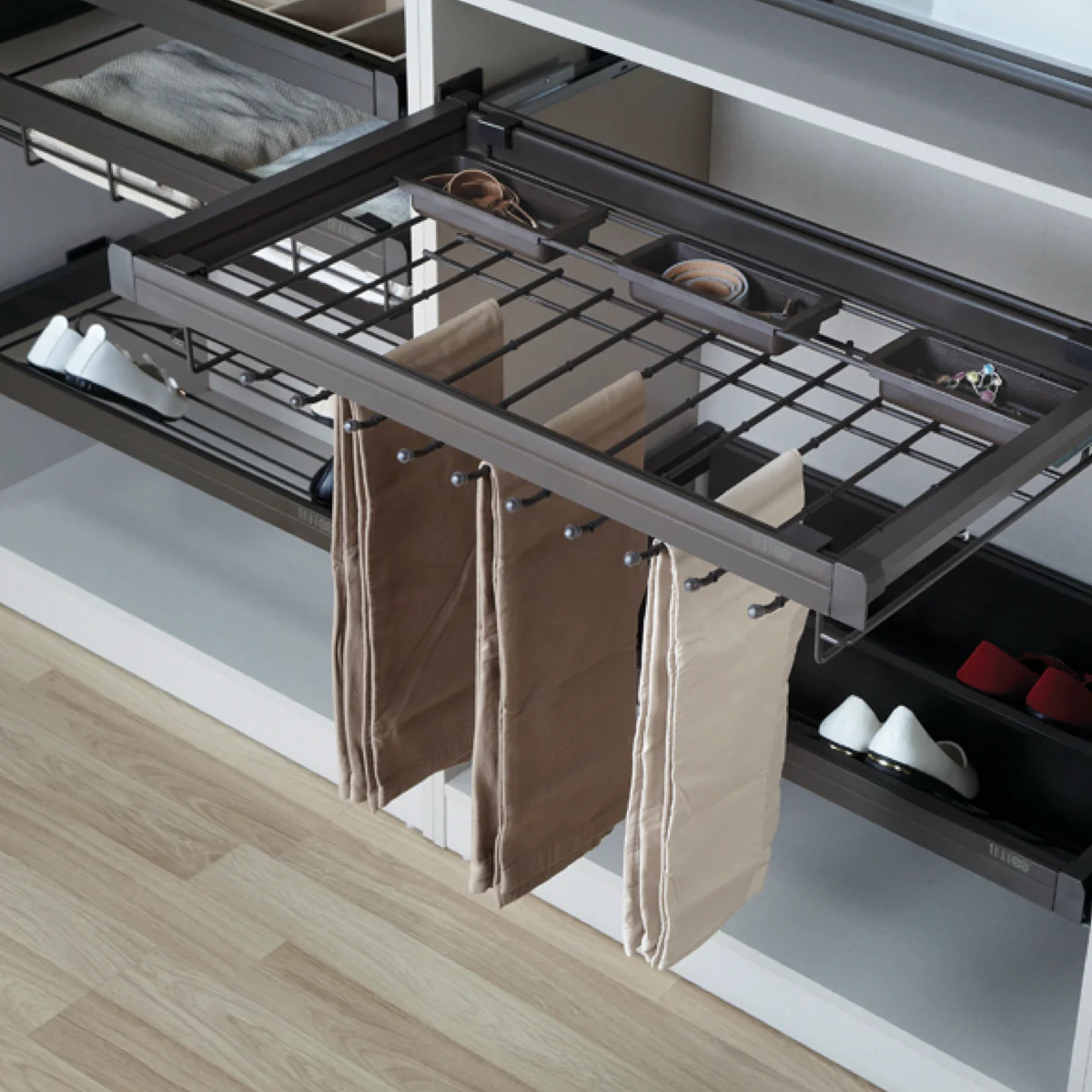 - Pantalonero para armarios de 700mm de ancho ajustable de 664 a 714mm con guías deslizantes incluidas con cierre silencioso amortiguado.
