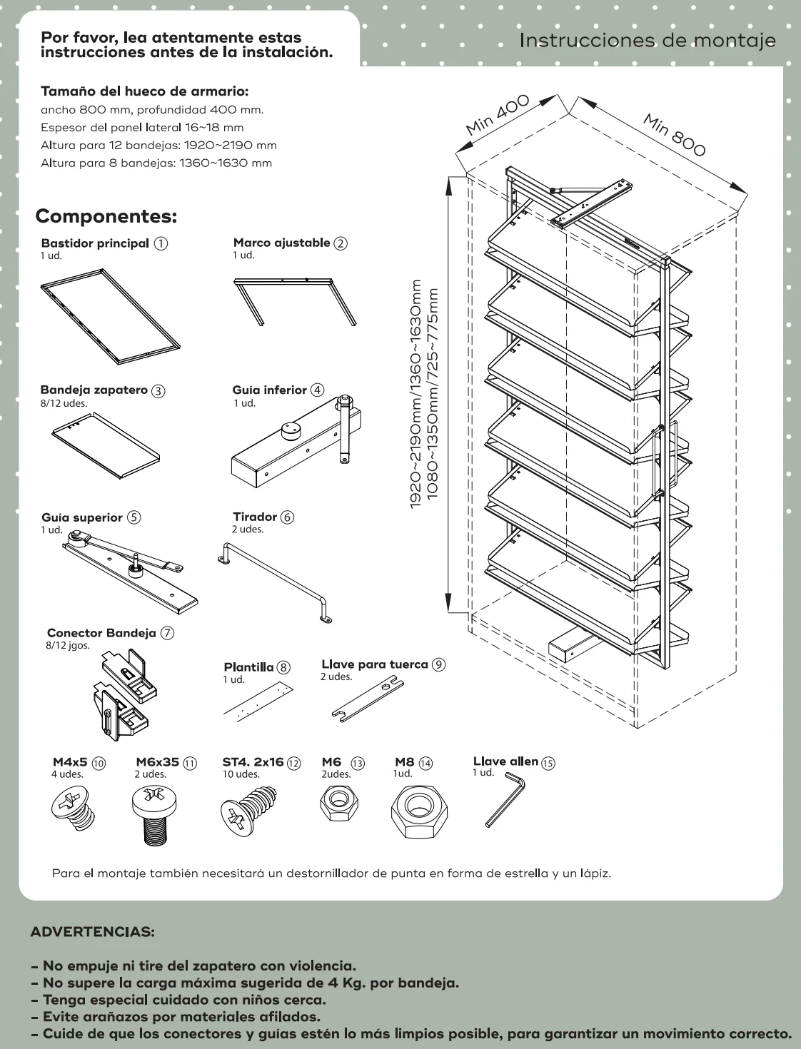 | Capacidad máxima | 32kg (3/4 pares de zapatos x balda) |